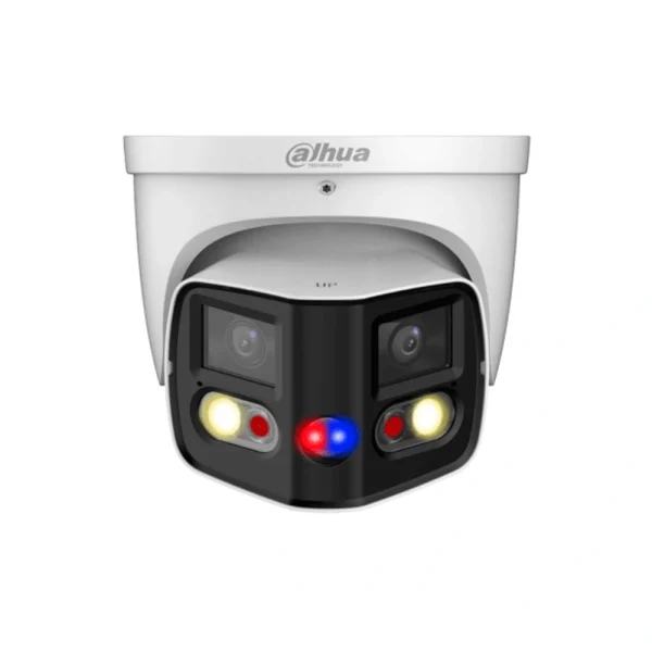 Cámara IP Dahua 2×4MP con visión 180°, SMD 4.0, disuasión activa, IR/LED nocturno, audio bidireccional, y protección IP67.