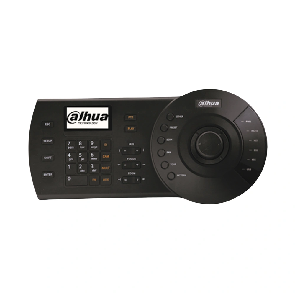 El DAHUA NKB1000-E es un teclado controlador profesional con joystick de 3 ejes para gestionar cámaras PTZ IP o analógicas, DVRs/NVRs y plataformas Dahua. Incluye pantalla LCD retroiluminada, soporte para SmartPSS y múltiples interfaces de comunicación (RJ-45, RS232, RS485, USB).