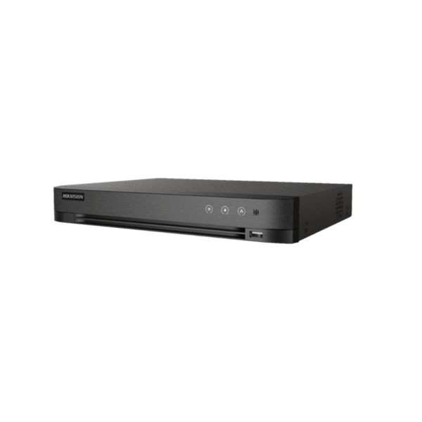 DVR Hikvision IDS-7204HQHI-M1/S de 4 canales con IA AcuSense, compresión H.265 Pro+ y soporte híbrido para cámaras analógicas e IP hasta 6 MP.