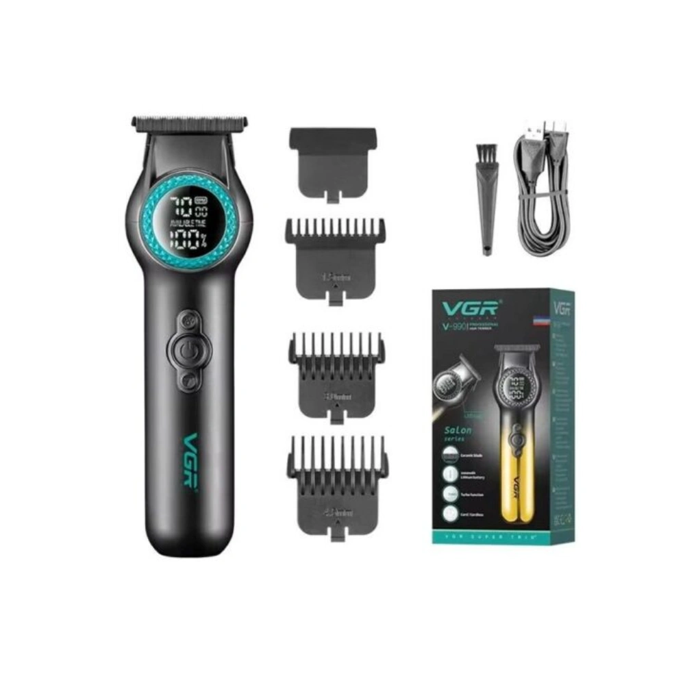 Cortadora profesional VGR V-990 con motor de 8000 RPM, cuchillas de acero inoxidable, carga rápida USB-C e indicador LED de batería. Precisión y comodidad aseguradas.